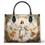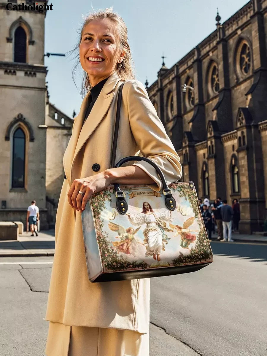 Questa borsa in pelle dal design elegante cattura la scena maestosa dell'Ascensione di Gesù Cristo, circondato da luce divina ed elementi celesti. Al centro della composizione, Gesù è raffigurato in abiti bianchi fluenti, che si innalza graziosamente nel cielo con le braccia aperte in un gesto di benedizione e accoglienza. La sua espressione serena irradia pace e amore, mentre raggi dorati emanano dietro di lui, simboleggiando la sua gloria divina.