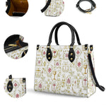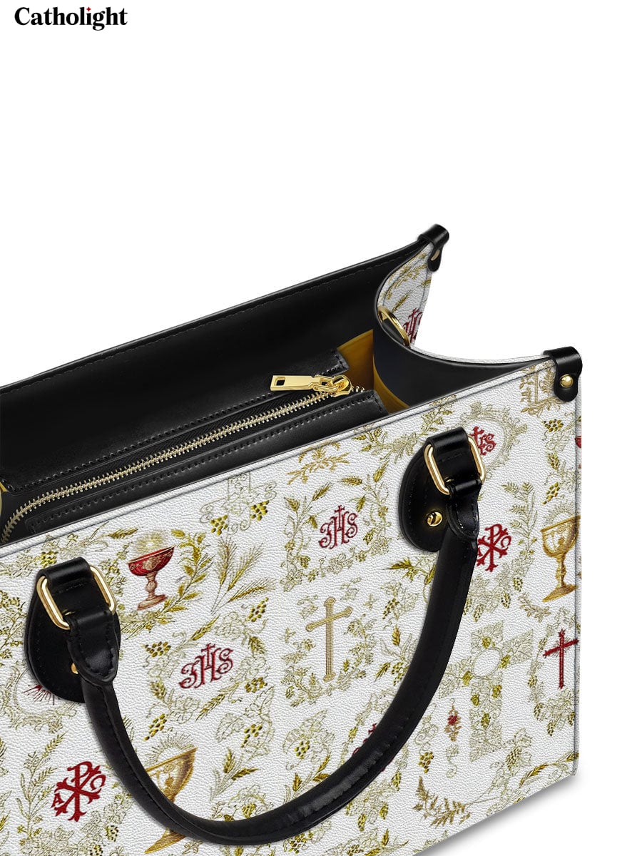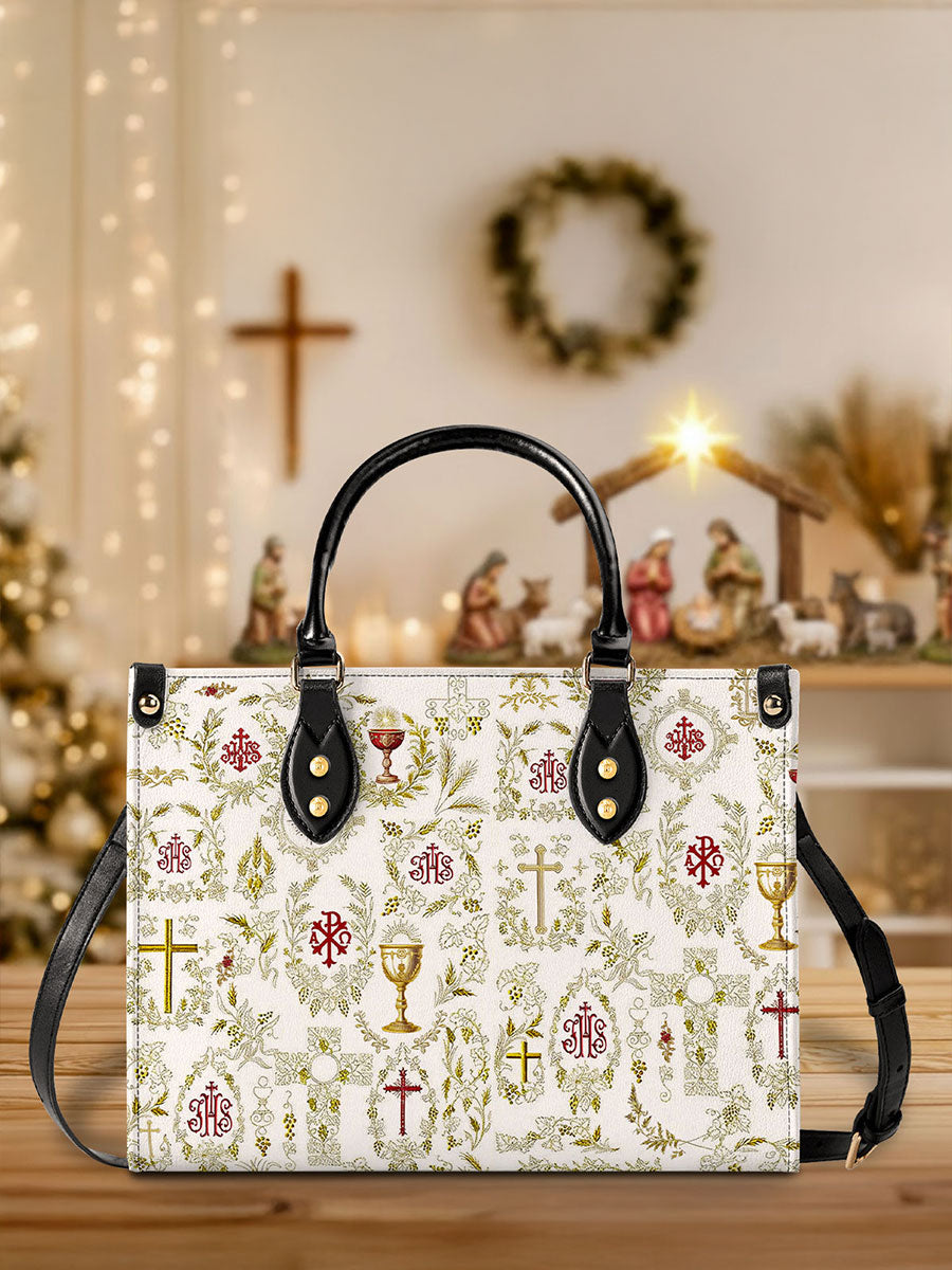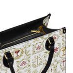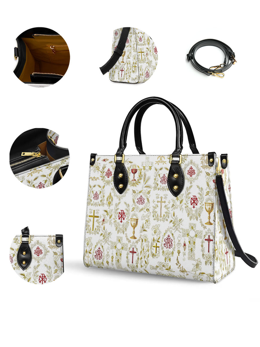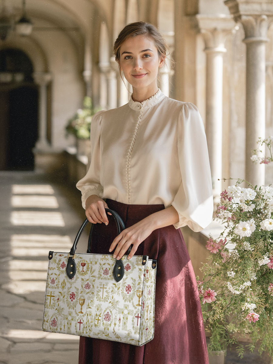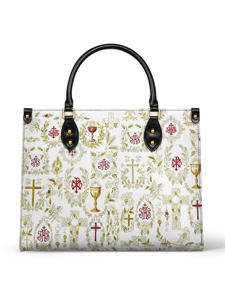Questa elegante borsa in pelle presenta un motivo raffinato e intricato di simboli cristiani sacri, tra cui la croce, il calice, l'ostia e i monogrammi sacri. Ogni emblema è splendidamente adornato con accenti dorati ed è circondato da delicati motivi floreali e di viti, simboleggiando la ricchezza e la profondità della fede cattolica. La combinazione armoniosa di bianco, oro e rosso profondo crea un design senza tempo e riverente, celebrando i misteri sacri e la bellezza della devozione.