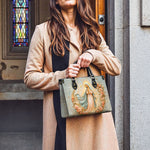 Questa squisita borsa in pelle presenta un'immagine serena della Beata Vergine Maria che si erge graziosamente su una luna crescente, circondata da delicate rose e da una morbida luce dorata. L'opera d'arte simboleggia magnificamente la purezza, l'umiltà e il ruolo di Maria come Regina del Cielo. I dettagli intricati del suo velo fluente e le morbide tonalità pastello evocano pace, grazia e amore divino, creando un pezzo significativo che irradia fede e devozione.